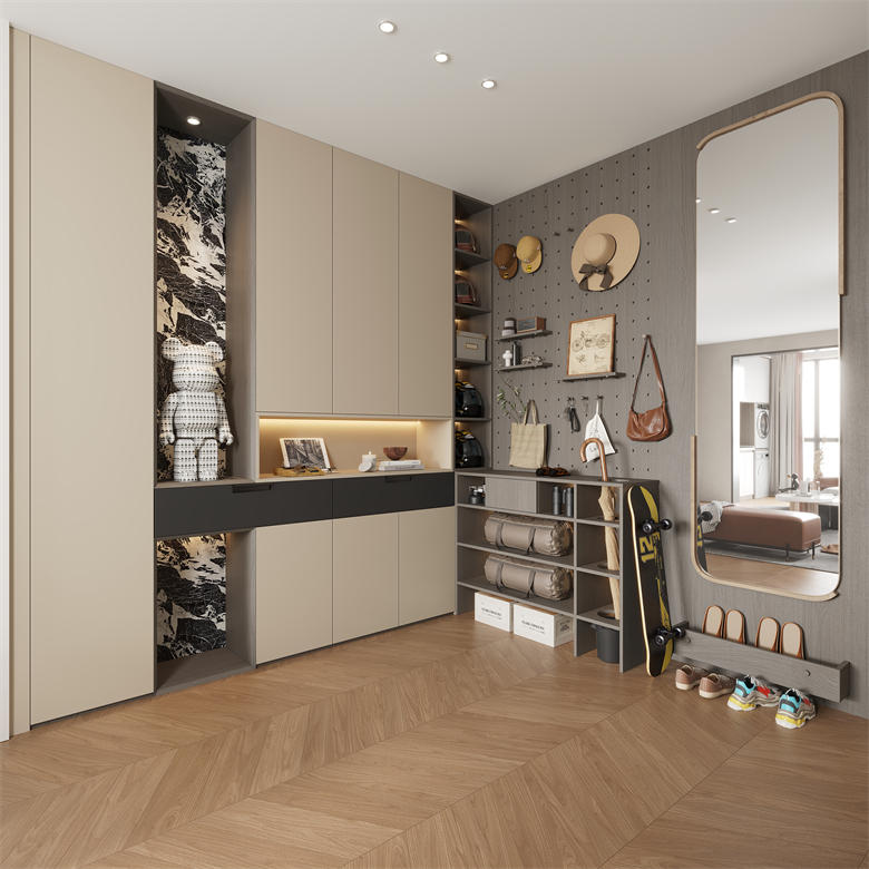 推開家門,迎面而來的是精心設(shè)計(jì)的玄關(guān)空間。這里不僅是收納功能區(qū)域,更是從喧囂都市回歸寧靜生活的過渡地帶。趣逸系列玄關(guān)以穿插式設(shè)計(jì)手法打造立體視覺層次,創(chuàng)意洞洞板讓收納兼具功能性與藝術(shù)感。