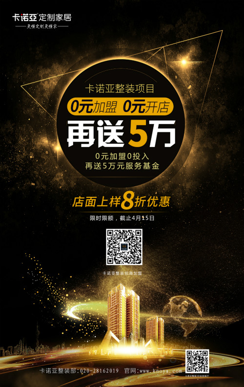 加盟卡諾亞整裝重磅喜訊來了:0元加盟,再送5萬元服務(wù)基金,享受店面上樣8折優(yōu)惠,政策僅限簽約前20名,截止4月15日。