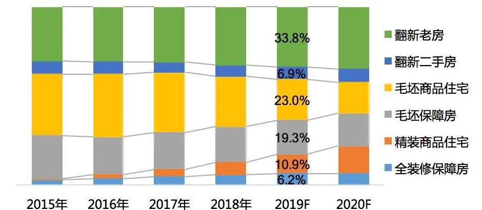 事實上,趨勢早已顯現(xiàn)。權(quán)威調(diào)研數(shù)據(jù)顯示,從住宅裝修市場的產(chǎn)值結(jié)構(gòu)來看,老房及二手房翻新市場在2019年合計占比超過40%,2020年將超過42%。而毛坯商品住宅市場的比重持續(xù)下降,2019年預(yù)計略低于23%,2020年可降至17.6%,毛坯房市場在2020年也將低于37%。由此,存量房翻新超過毛坯房市場產(chǎn)值規(guī)模的時代將繼續(xù)深化。